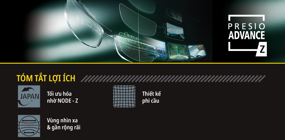 Với thiết kế phi cầu tiên tiến và vùng nhìn được mở rộng, Presio Advance Z giúp người dùng dễ dàng thích nghi và tận hưởng thị giác tự nhiên, mượt mà trong mọi hoạt động hàng ngày.