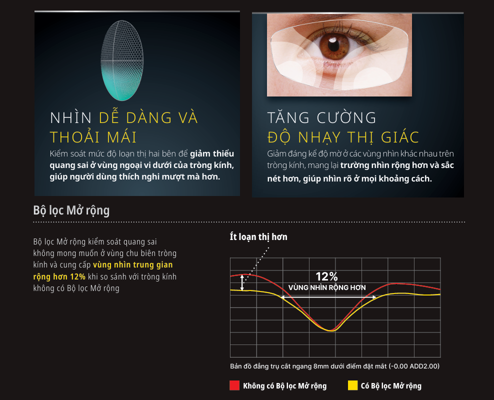 - Bộ lọc Mở Rộng (Wide Filter): Mở rộng vùng nhìn trung gian lên đến 12%, giúp chuyển đổi tầm nhìn xa – gần linh hoạt và thoải mái hơn khi làm việc, lái xe hoặc sử dụng máy tính.