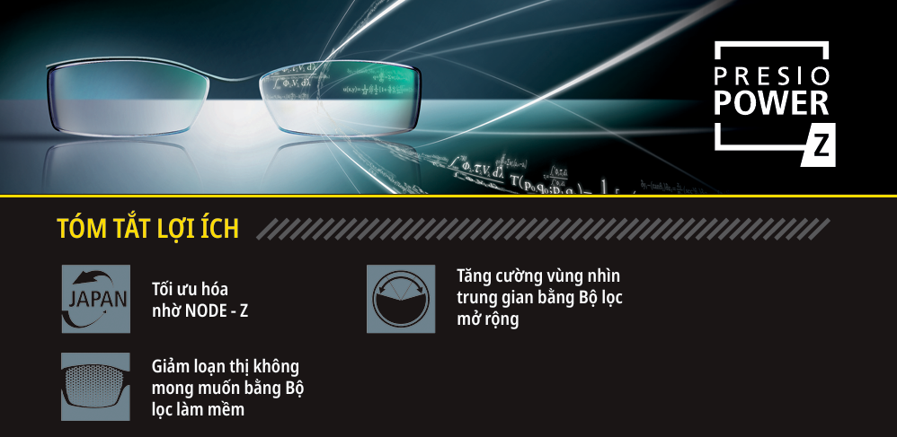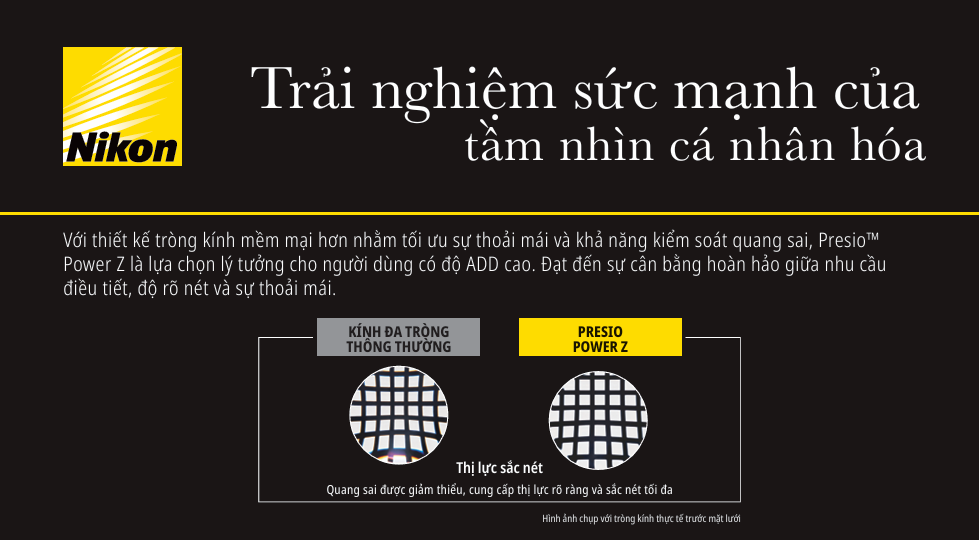 Nikon Presio Power Z là dòng tròng kính đa tròng cá nhân hóa cao cấp được thiết kế dành riêng cho những người có độ ADD cao và cần thị giác sắc nét, thoải mái trong mọi hoạt động. Với công nghệ quang học tiên tiến từ Nhật Bản, Presio Power Z mang đến tầm nhìn mượt mà, rõ ràng và tự nhiên hơn bao giờ hết – giúp người đeo tận hưởng sự cân bằng hoàn hảo giữa độ điều tiết, độ nét và cảm giác dễ chịu.