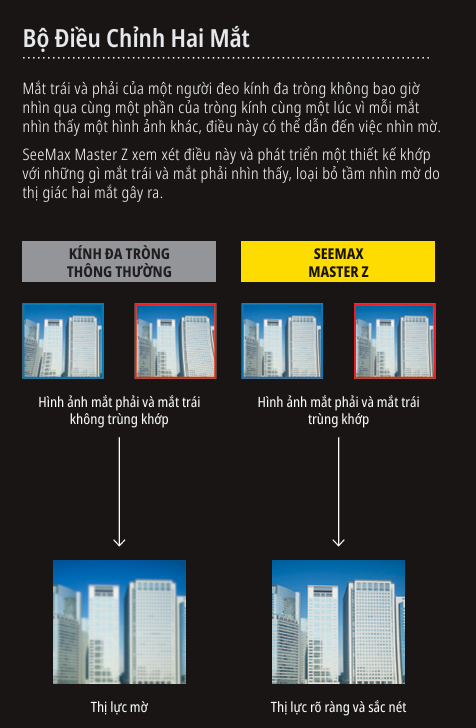 - Bộ Điều Chỉnh Hai Mắt (Binocular Harmonization Technology): Tự động cân bằng giữa mắt trái và mắt phải, giúp hình ảnh trùng khớp hoàn hảo – loại bỏ hiện tượng mờ và sai lệch hình học thường gặp ở kính đa tròng thông thường.
