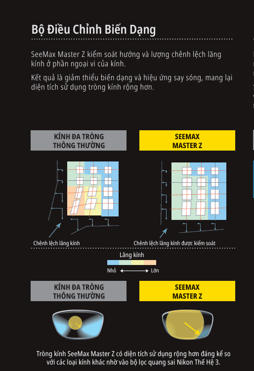 Tròng kính Nikon SeeMax Master Z là dòng đa tròng kỹ thuật số thế hệ mới, ứng dụng công nghệ NODE-Z độc quyền của Nikon nhằm kiểm soát quang sai và mang đến tầm nhìn tự nhiên, rõ nét và thoải mái vượt trội.