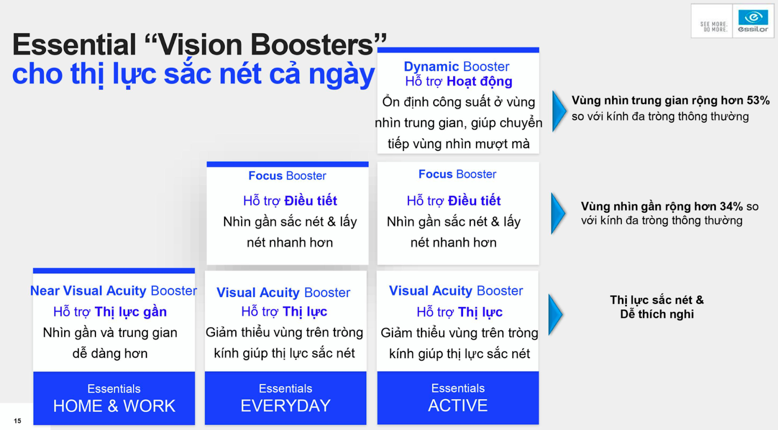 Visual Acuity (Booster): Visual acuity booster (Hỗ trợ thị lực) là quy đánh tròng kỹ thuật số mới nhất của Essilor, giúp tăng cường độ chính xác ở mỗi điểm trên bề mặt tròng kính.