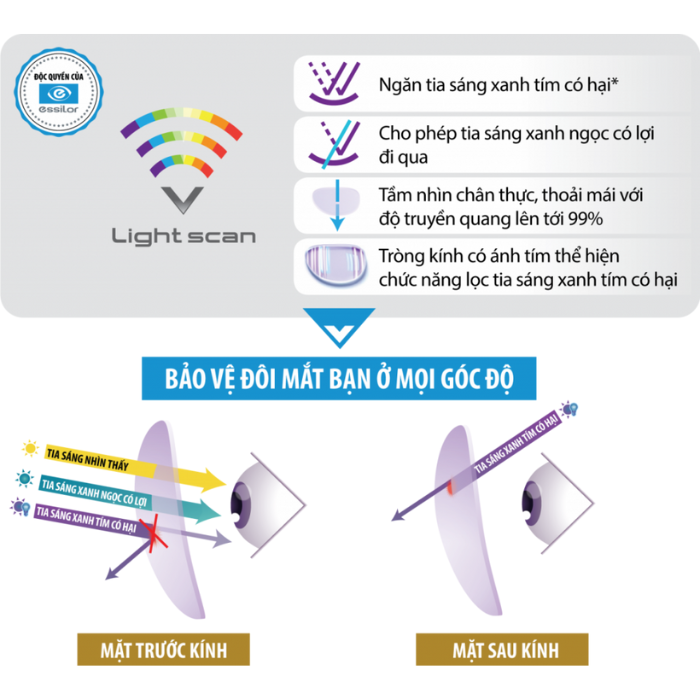 Essilor giới thiệu công nghệ lọc ánh sáng xanh thông minh Light ScanTM của Crizal Prevencia có công dụng ngăn tia sáng xanh tím có hại, đồng thời cho phép tia sáng xanh ngọc có lợi đi qua, đảm bảo tối ưu cho sức khỏe của bạn. Công nghệ chống ánh sáng xanh thông thường trên thị trường sẽ cắt hết cả hai loại ánh sáng xanh này mà không có sự phân biệt, vô tình sẽ gây ảnh hưởng ngược tới sức khỏe nên bạn cần lưu ý tới vấn đề này.