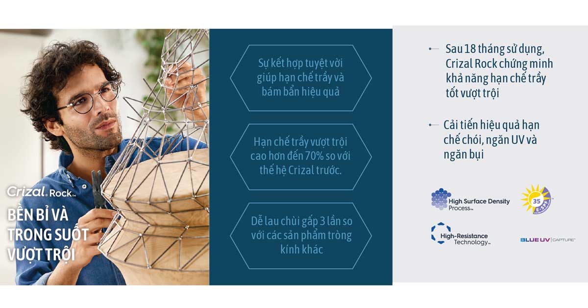 Tròng kính công nghệ mới Crizal® Rock giúp xóa tan mọi lo âu về vấn đề trầy xước và bụi bẩn trên tròng kính.