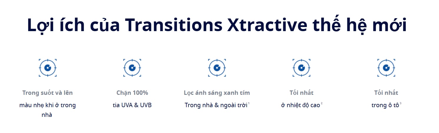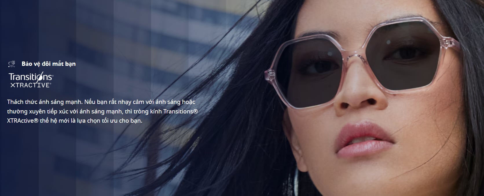 Transitions® XTRActive™ – Phiên bản đổi màu cao cấp hơn Nếu bạn thường xuyên lái xe hoặc hoạt động ngoài trời dưới ánh sáng mạnh, Transitions® XTRActive™ là lựa chọn tối ưu. Phiên bản này có khả năng đổi màu tối hơn, hiệu quả ngay cả khi ngồi trong xe hơi và bảo vệ mắt tốt hơn trong điều kiện ánh sáng gay gắt.