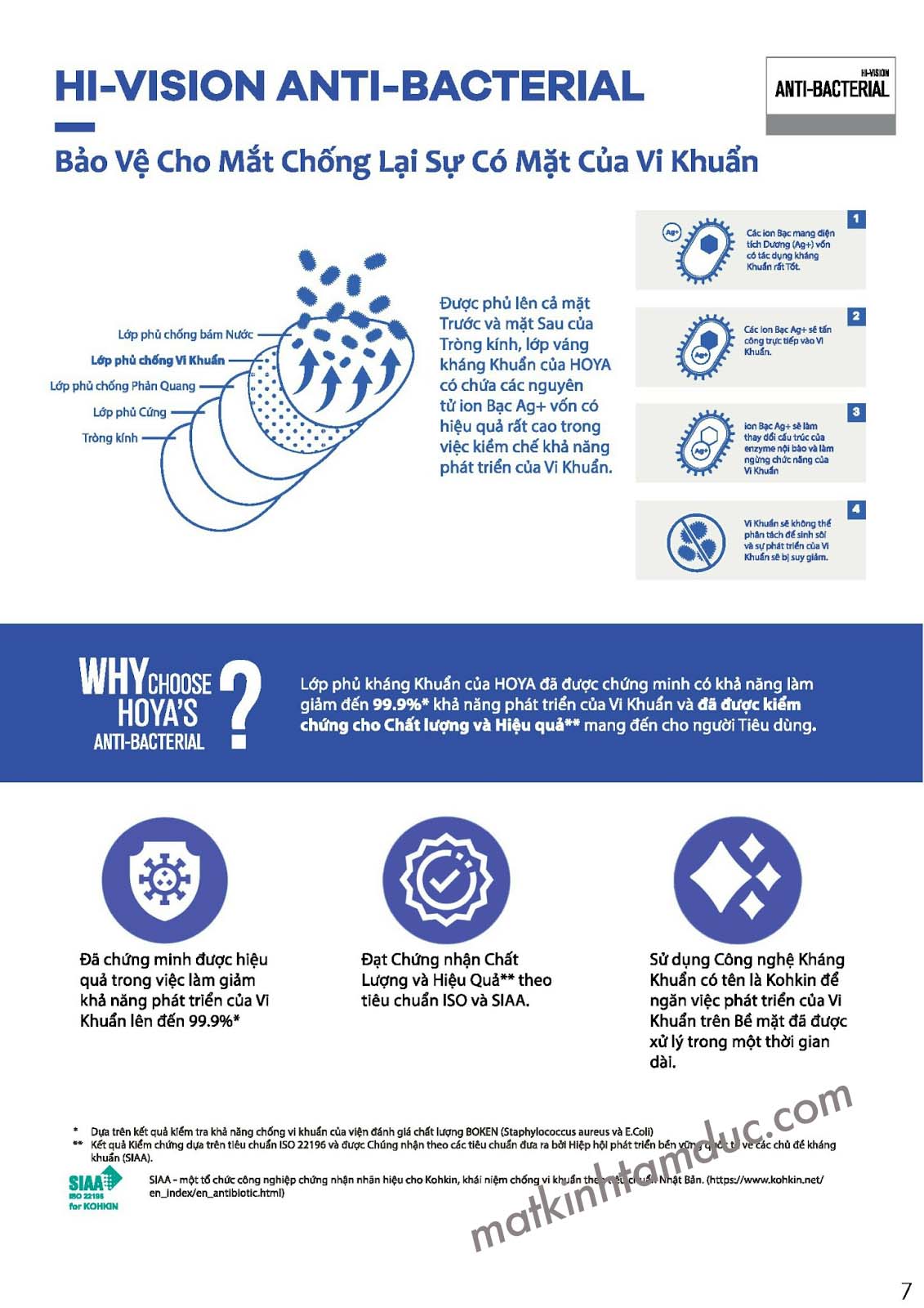Lớp phủ kháng khuẩn “Kohkin” trên cả mặt trước và sau của tròng kính, giúp giảm sự phát triển của vi khuẩn đến 99,9%, được kiểm chứng theo tiêu chuẩn ISO 22196 và chứng nhận bởi Hiệp hội Phát triển Bền vững Quốc tế về Kháng Khuẩn (SIAA).