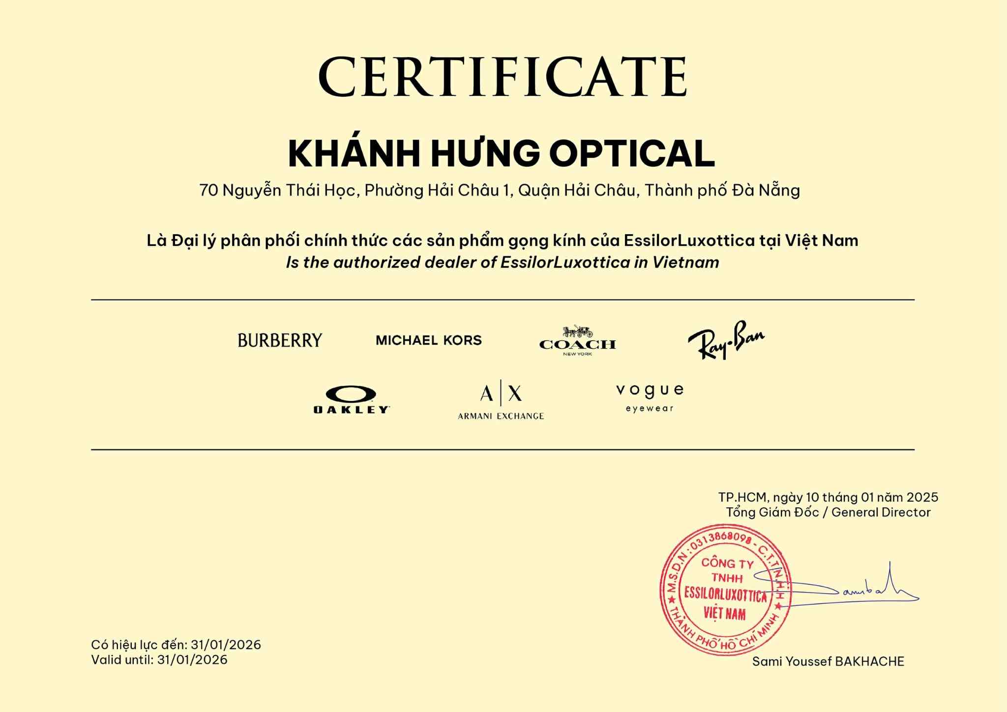 Đặc biệt, Khánh Hưng tự hào là đại lý phân phối chính thức của tập đoàn EssilorLuxottica tại Đà Nẵng - tập đoàn hàng đầu thế giới sở hữu những thương hiệu kính mắt danh giá như Ray-Ban, Oakley, Armani Exchange, Vogue Eyewear, Coach….